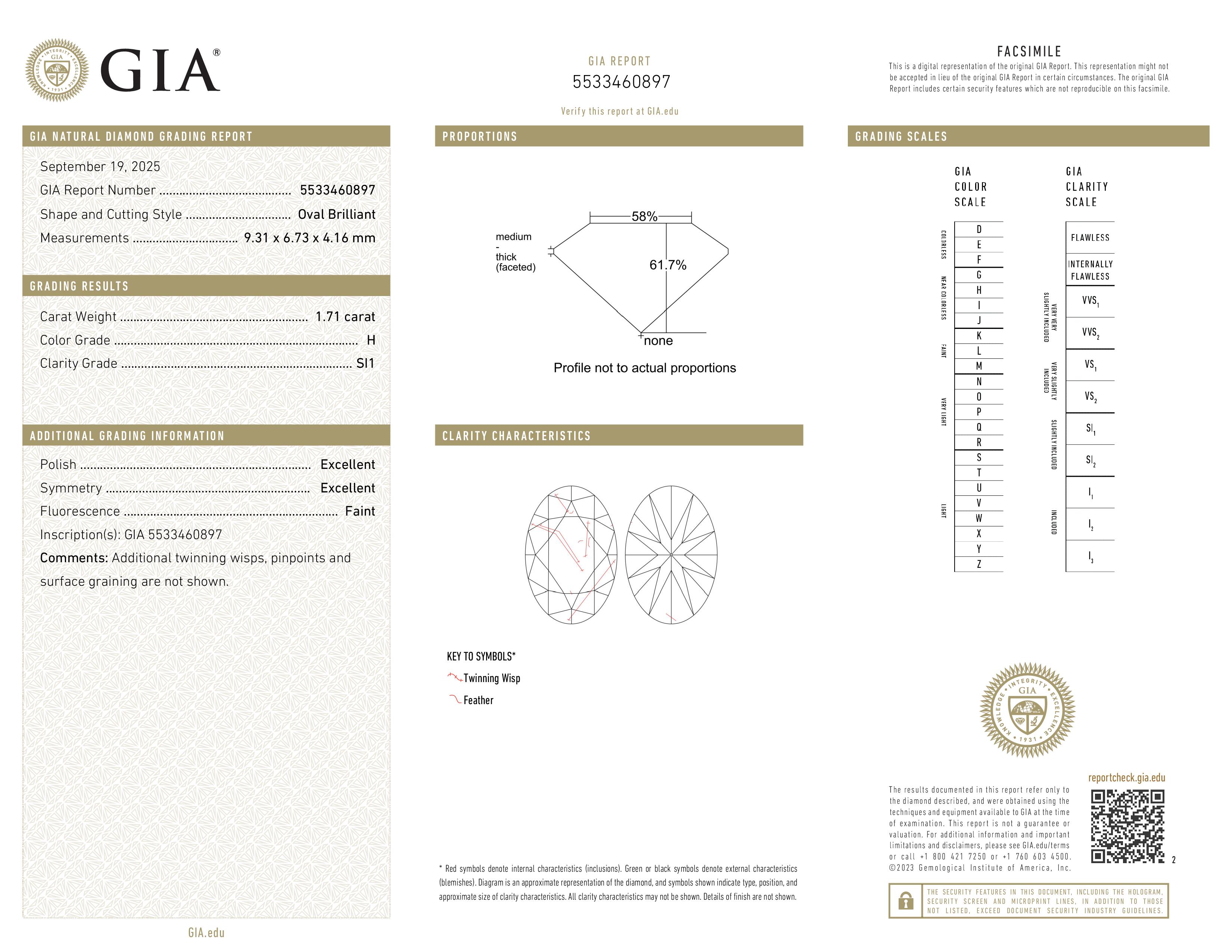 Роскошный бриллиант в 1.71 карат, формы овал . Размер 9.31x6.73x4.16 полностью соответствует установленным стандартам для этой формы и массы камня. Оптимальная огранка подчеркивает и выделяет лучшие свойства этого бриллианта. Небольшая флюоресценция находится в рамках нормы. Очень выгодная цена. Хорошая ликвидность на вторичном рынке.