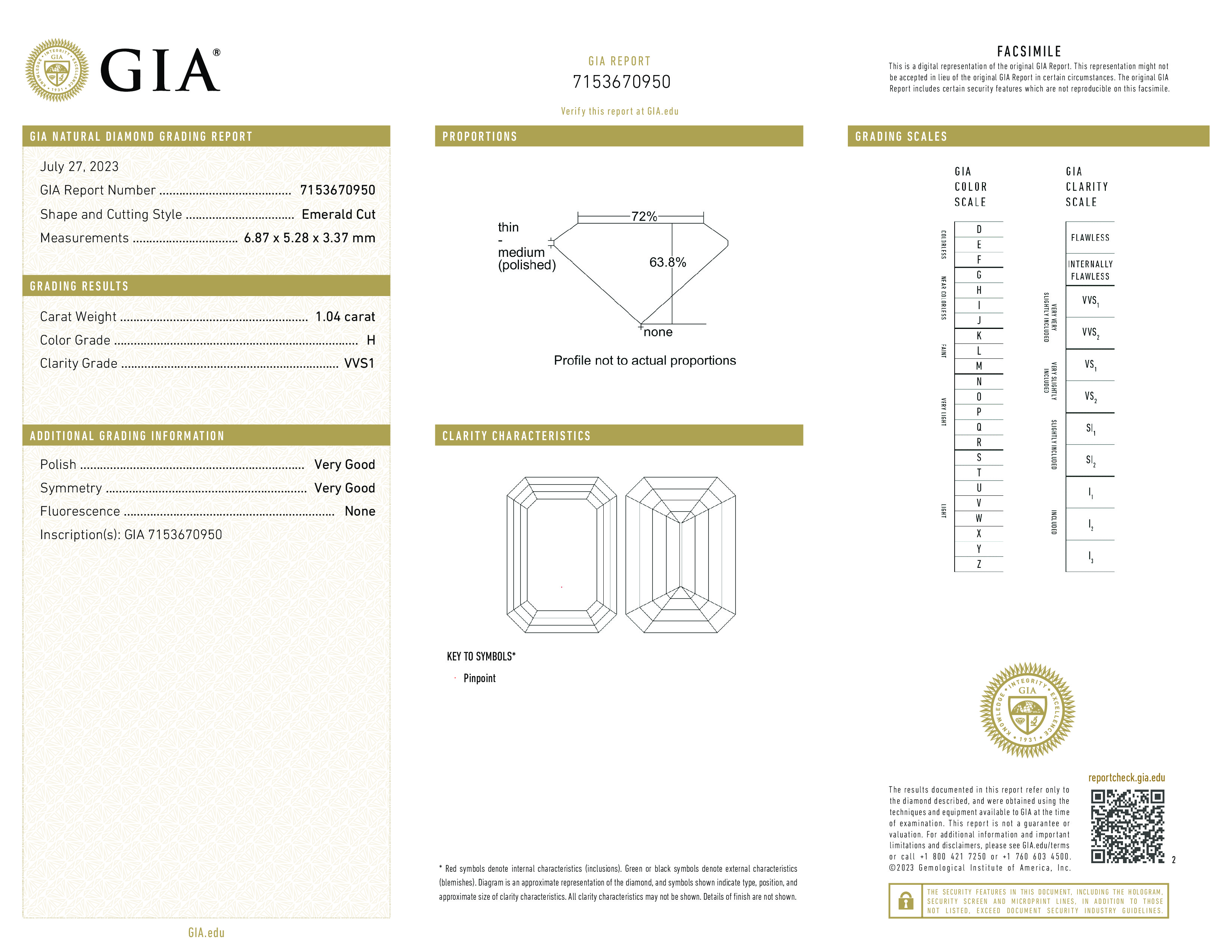 Роскошный бриллиант в 1.04 карат, формы изумруд . Размер 6.87x5.28x3.37 полностью соответствует установленным стандартам для этой формы и массы камня. Флюоресценция полностью отсутствует, что встречается лишь у 15% от всех добываемых бриллиантов. Высокая ликвидность на вторичном рынке.