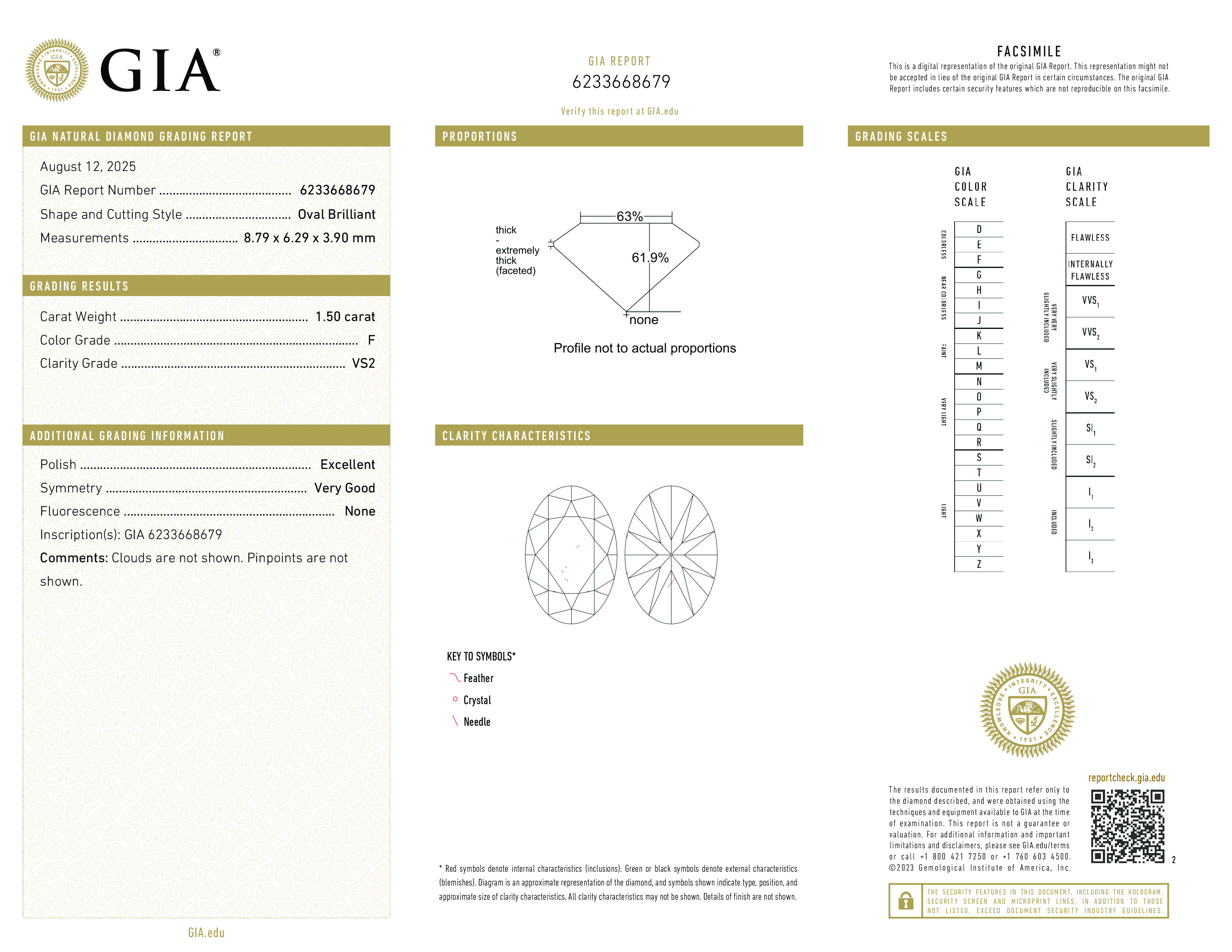 Роскошный бриллиант в 1.50 карат, формы овал . Размер 8.79x6.29x3.9 полностью соответствует установленным стандартам для этой формы и массы камня. Флюоресценция полностью отсутствует, что встречается лишь у 15% от всех добываемых бриллиантов. Высокая ликвидность на вторичном рынке.
