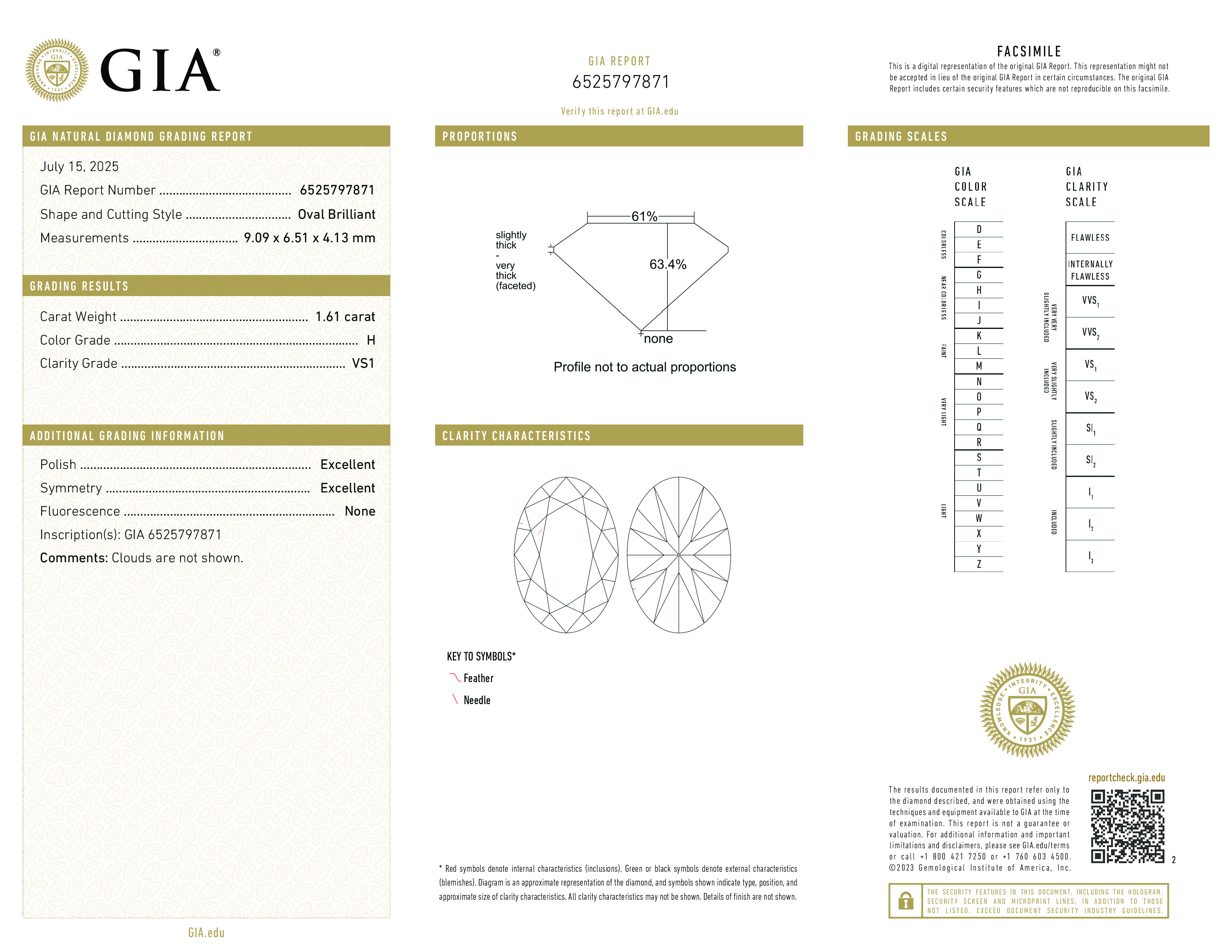 Роскошный бриллиант в 1.61 карат, формы овал . Размер 9.09x6.51x4.13 полностью соответствует установленным стандартам для этой формы и массы камня. Флюоресценция полностью отсутствует, что встречается лишь у 15% от всех добываемых бриллиантов. Высокая ликвидность на вторичном рынке.