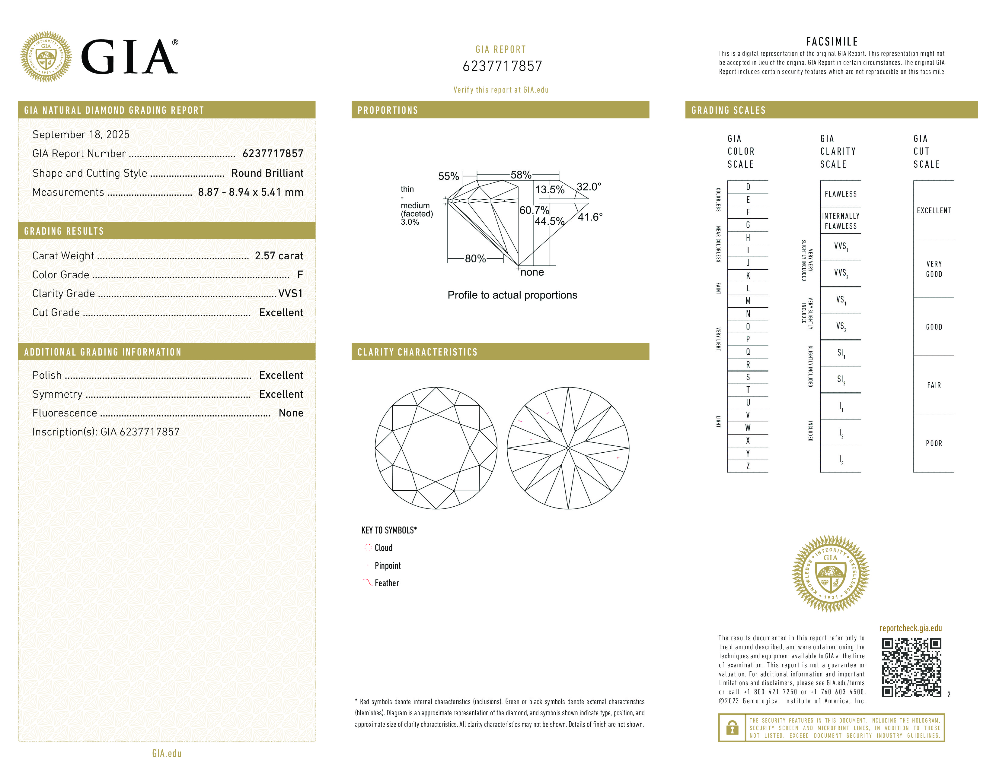 Фантастический бриллиант в 2.57 карат, формы круглый . Размер 8.87x8.94x5.41 полностью соответствует установленным стандартам для этой формы и массы камня. Оптимальная огранка подчеркивает и выделяет лучшие свойства этого бриллианта. Флюоресценция полностью отсутствует, что встречается лишь у 15% от всех добываемых бриллиантов. Очень выгодная цена. Высокая ликвидность на вторичном рынке.